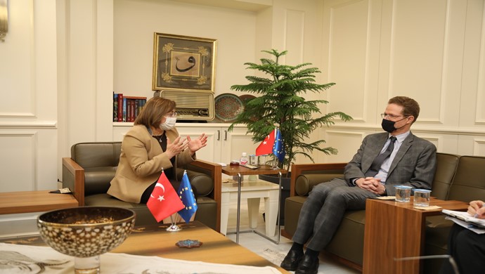 Gaziantep Büyükşehir Belediye Başkanı Fatma Şahin, Avrupa Birliği (AB) Türkiye Delegasyonu Başkanı Nikolaus Meyer-Landrut’u makamında ağırladı. Ziyarette Suriyeli mülteciler için gerçekleştirilen iş birliği projeleri ele alındı, fikir alışverişinde bulunuldu.