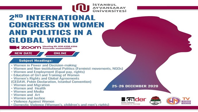 2. Uluslararası Küresel Dünyada Kadın ve Siyaset Kongresi, 25-26 Aralık 2020 tarihlerinde, İstanbul Ayvansaray Üniversitesi (İAÜ), Kadın Adayları Destekleme Derneği (KA.DER), Sosyalist Uluslararası Kadın Birimi ( SIW) ve Woman TV destekleriyle gerçekleştirilecek. Online platform üzerinden yapılacak ilk uluslararası kadın kongresine, 12 farklı ülkeden, 54 yazar katılacak. Kongreye ikinci kez başkanlık …