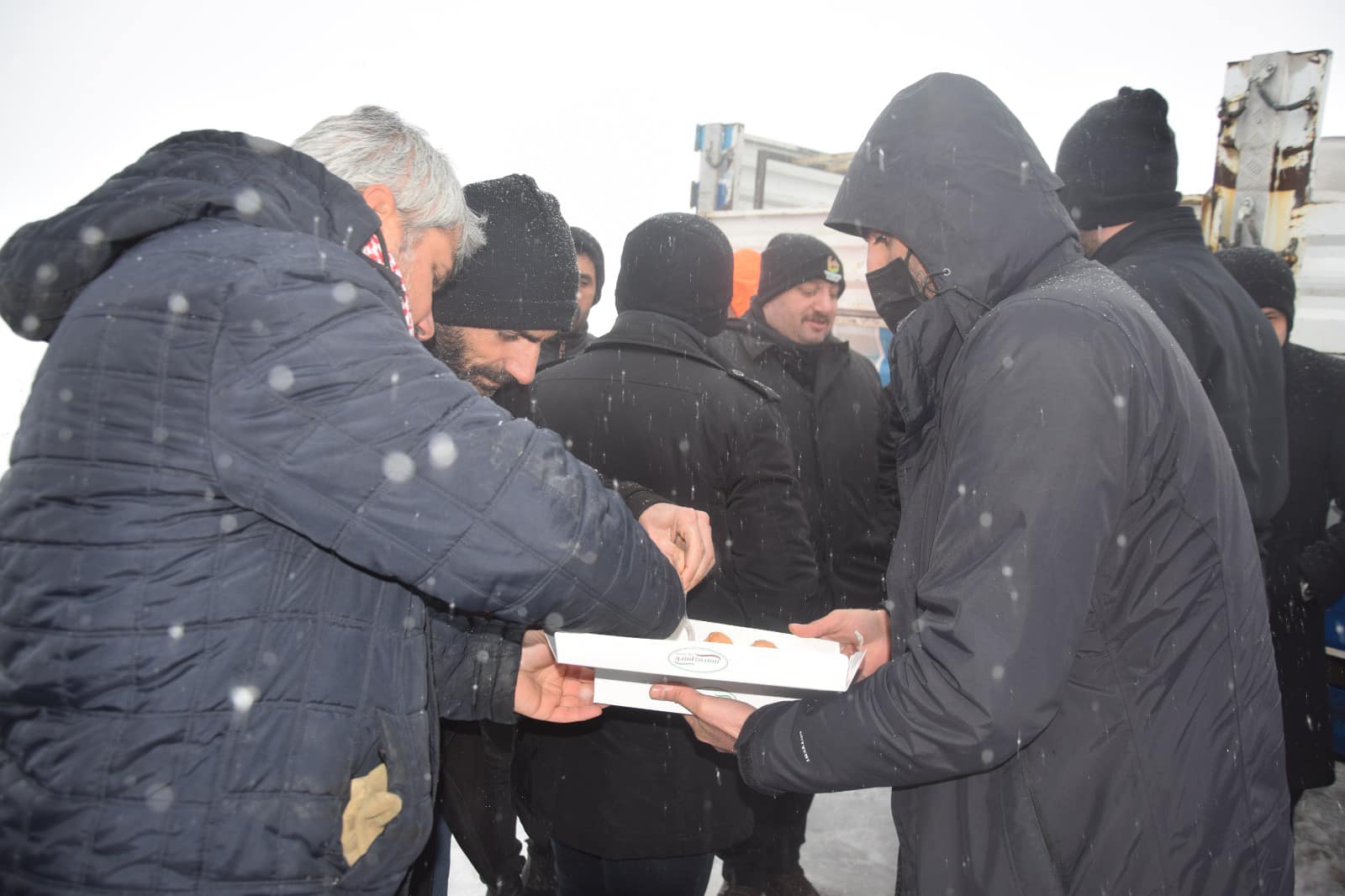 Başkan Ekinci ve Kaymakam Çengel’in soğuk havada mesai yapan işçilere tatlı ikramı ile gitmesi yol açma ekibine büyük moral oldu.