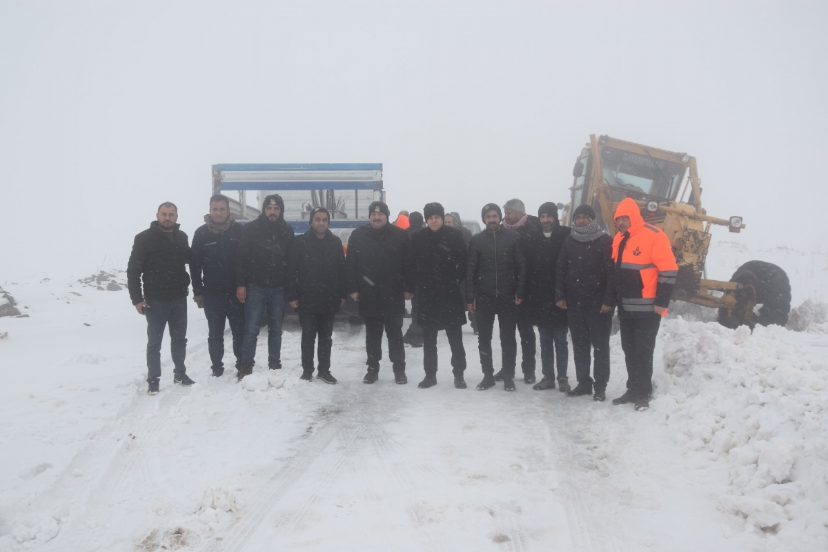 Yapılan açıklamaların ardından Başkan Ekinci ve Kaymakam Çengel, yol açma ekibine tatlı ikramında bulundu.